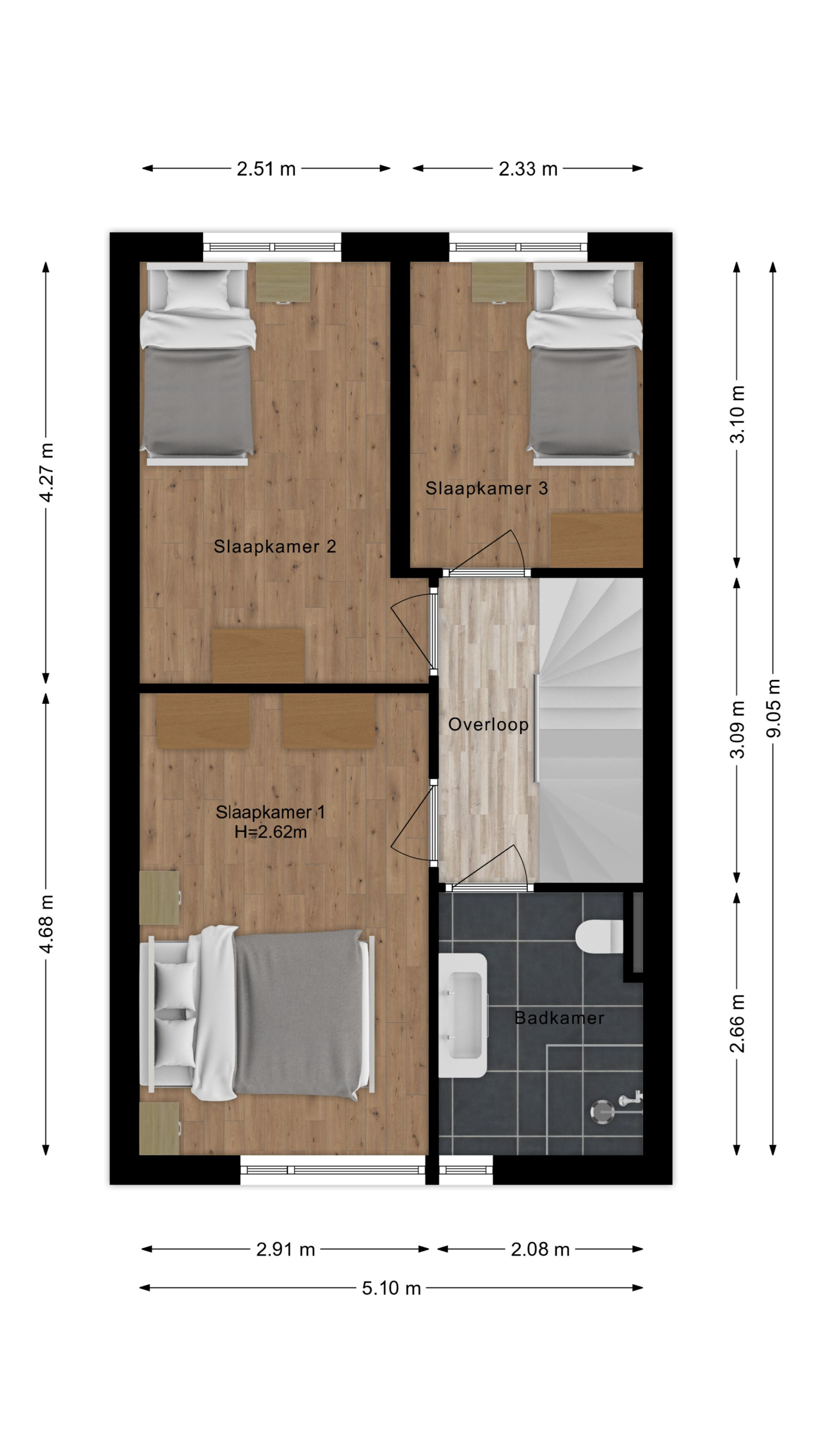 Op de eerste verdieping kom je uit op de overloop met toegang tot drie slaapkamers en de badkamer. De hoofdslaapkamer is royaal en biedt plaats aan een tweepersoonsbed en kastruimte. Daarnaast zijn er twee extra slaapkamers, ideaal te gebruiken als kinder-, werk- of logeerkamer.