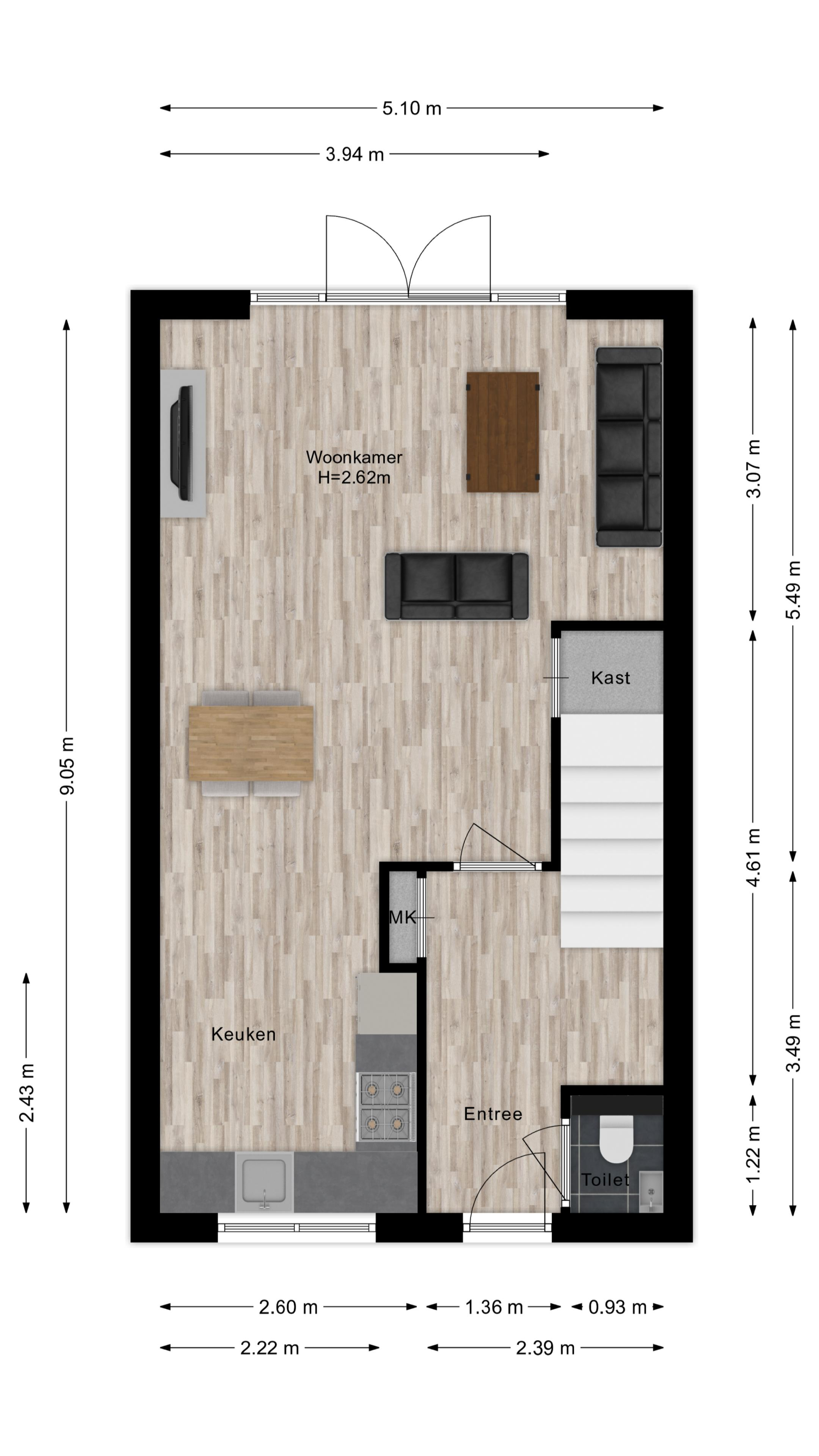De gehele begane grond is voorzien van lichte PVC-vloer en heeft een prettige plafondhoogte (2,62m), wat bijdraagt aan het ruimtelijke gevoel.