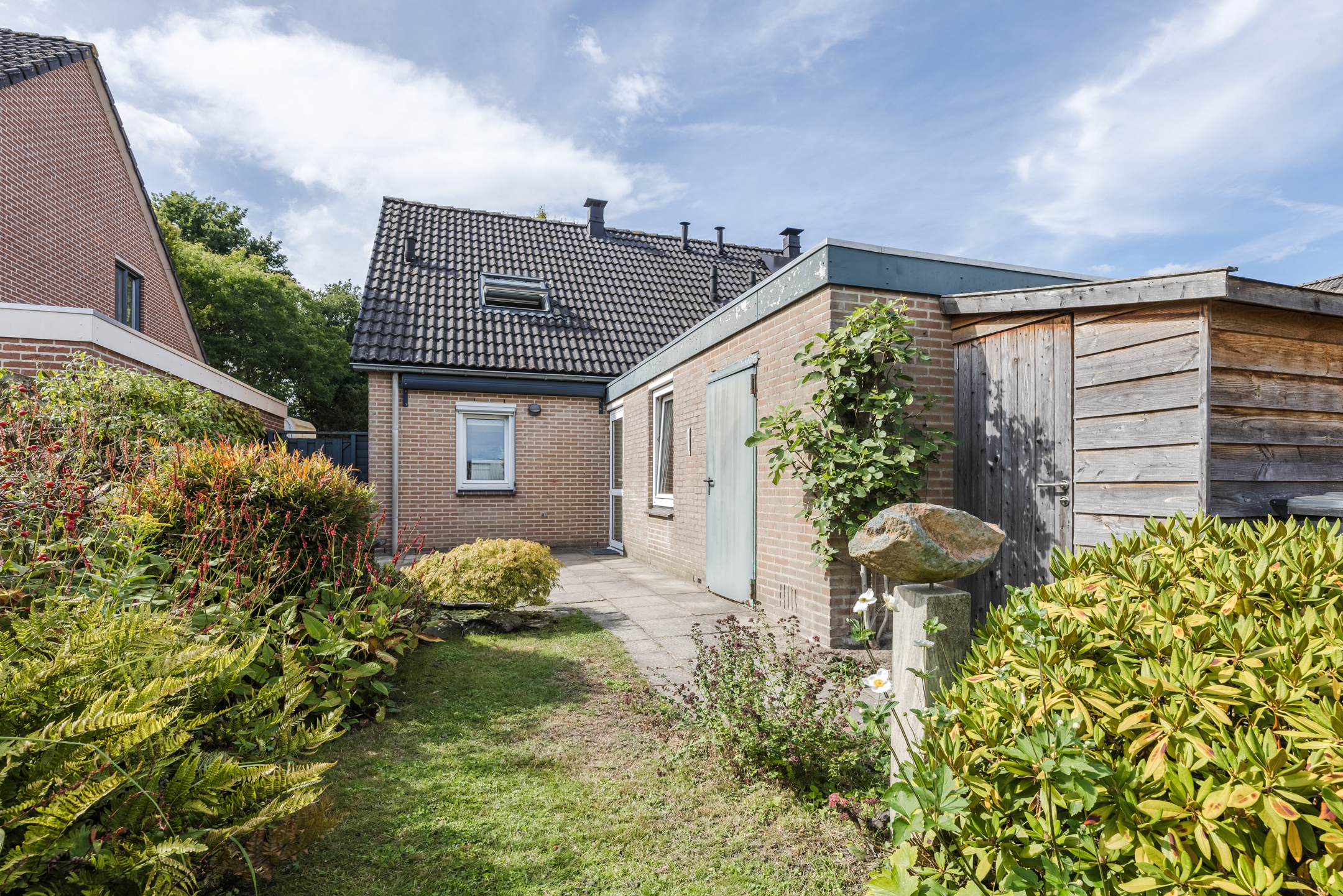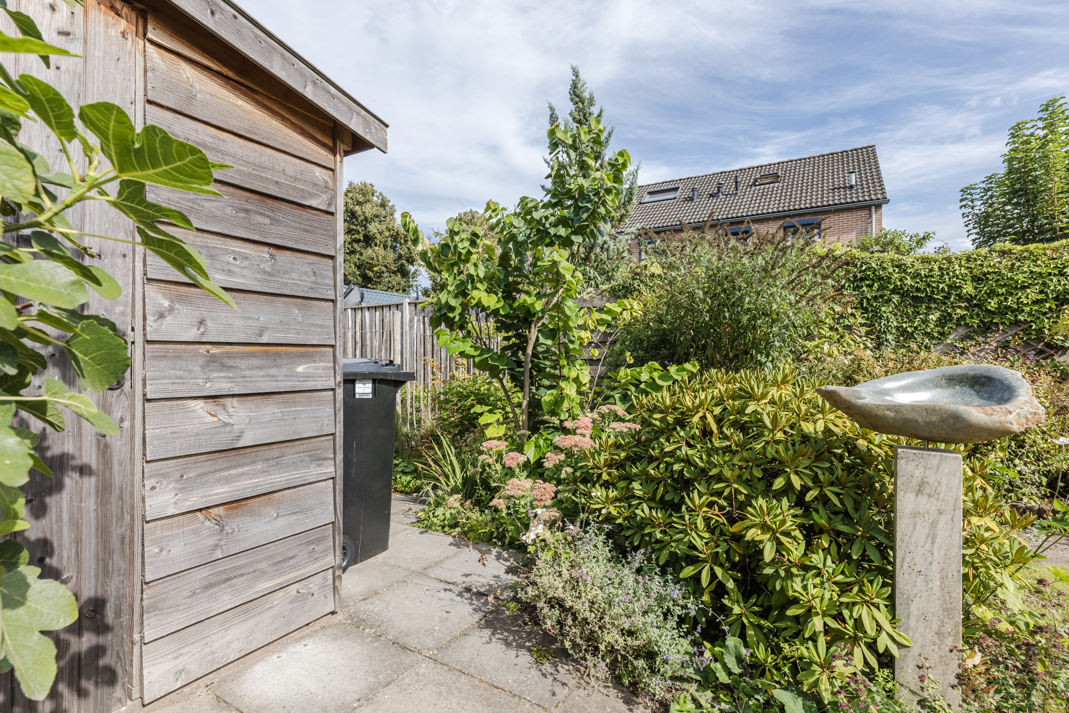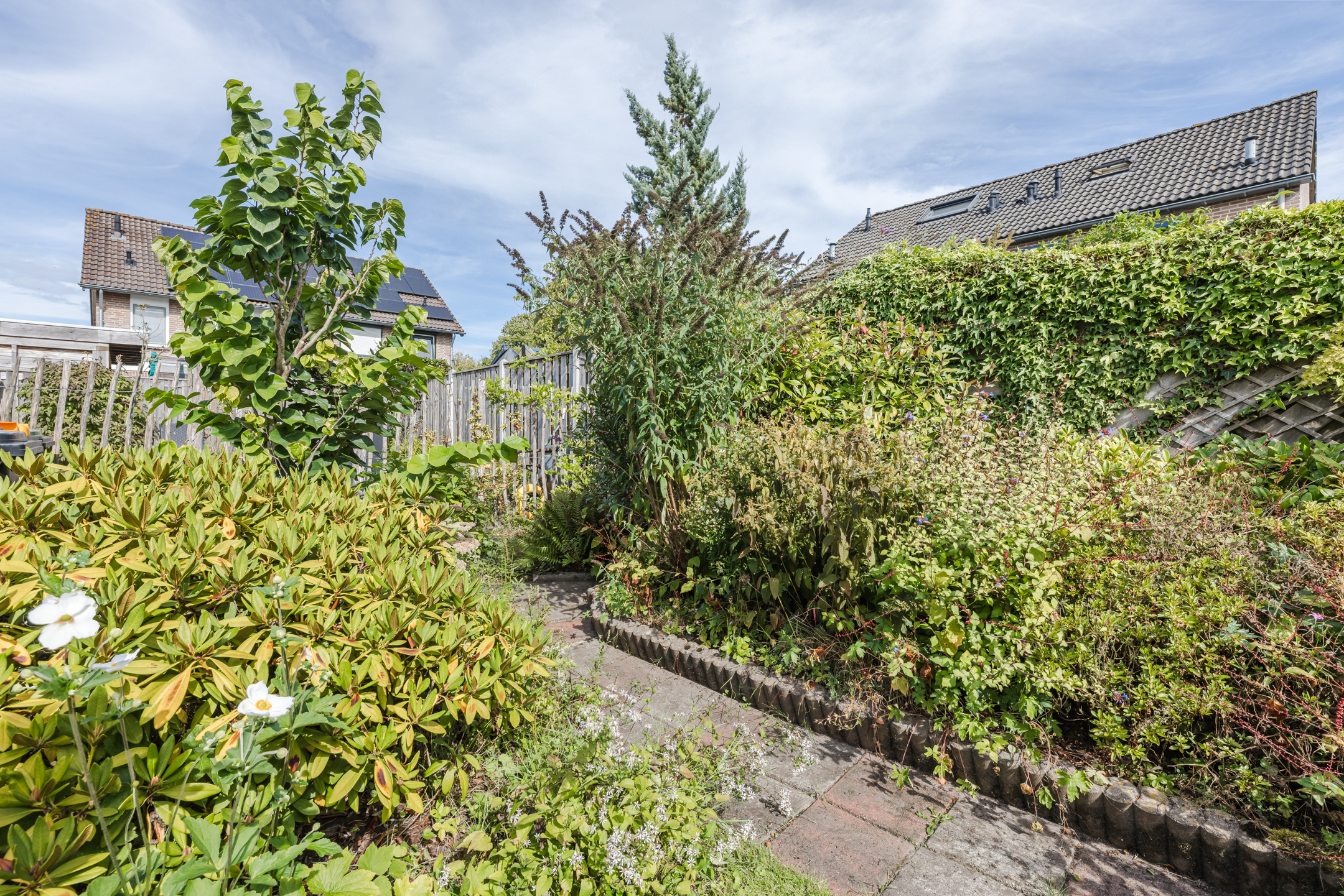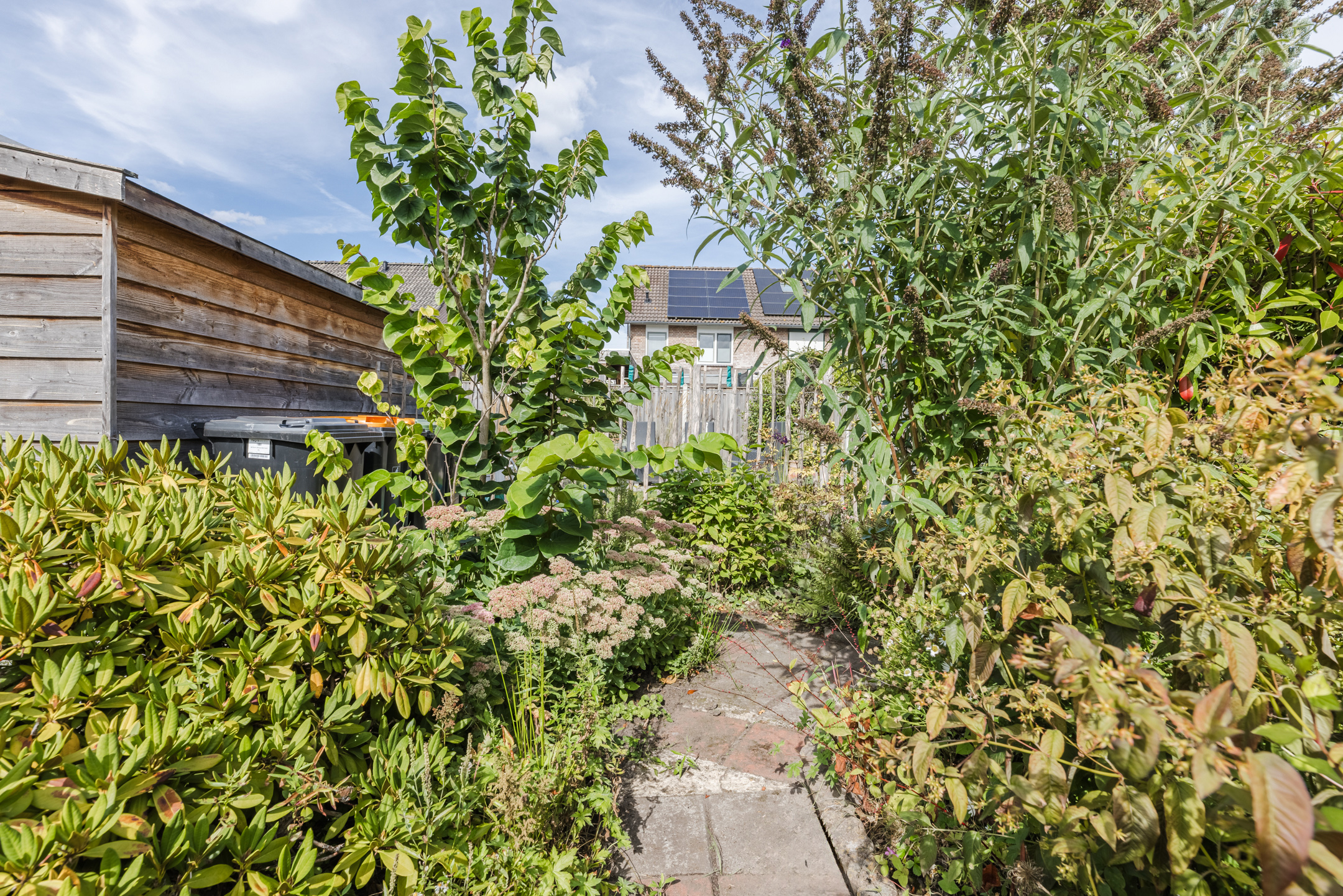 De woning beschikt over een tuin op het zuidoosten met volop groen, waar je heerlijk kunt genieten van rust en privacy. Dankzij de combinatie van sierlijke beplanting, een gazon en een terras is er ruimte om buiten te zitten, te tuinieren of gewoon te ontspannen. Aan de achterzijde van de woning bevinden zich bovendien twee bergingen: praktisch voor fietsen, tuingereedschap of als hobbyruimte. De tuin is gemakkelijk te bereiken via de zijkant van de woning.