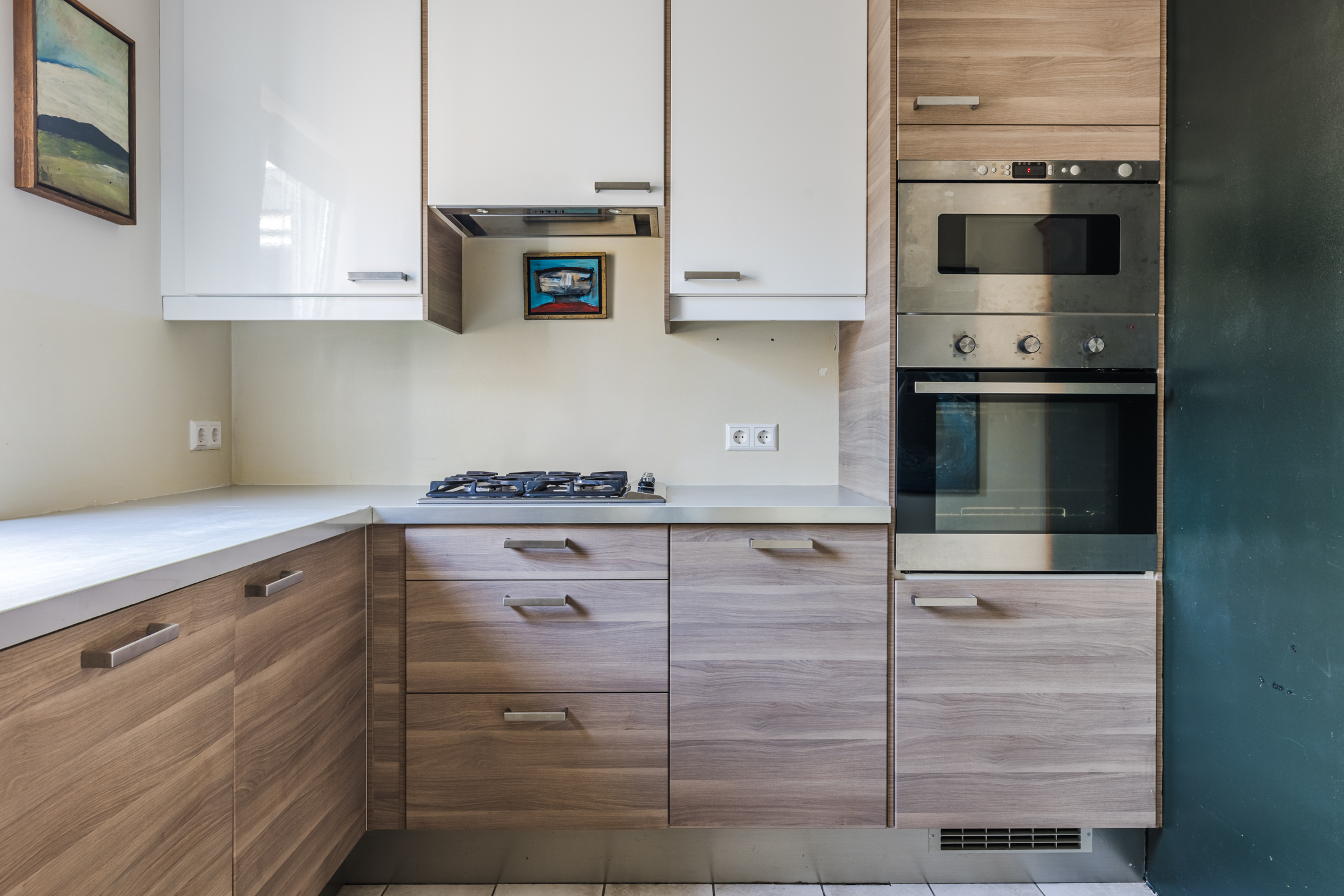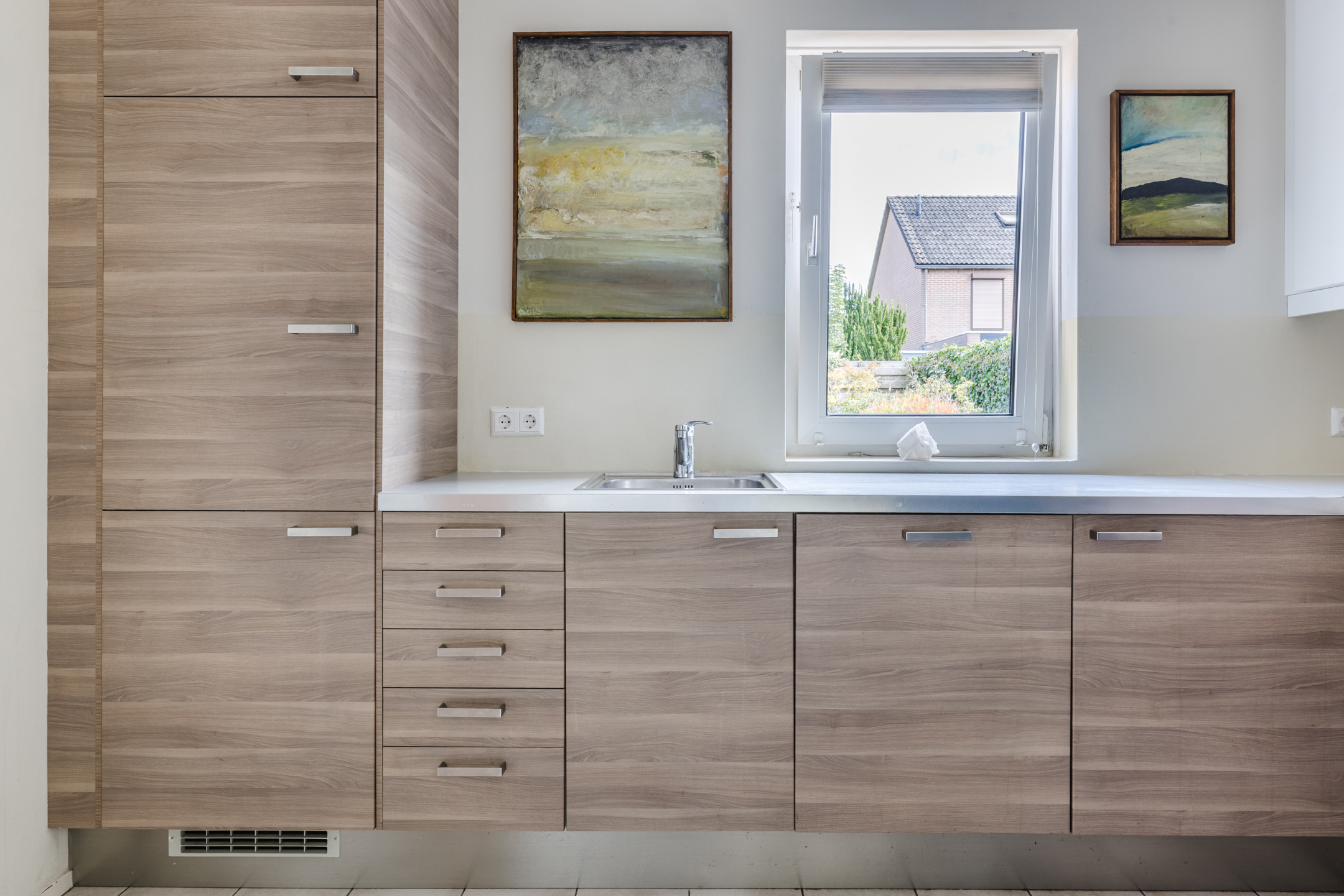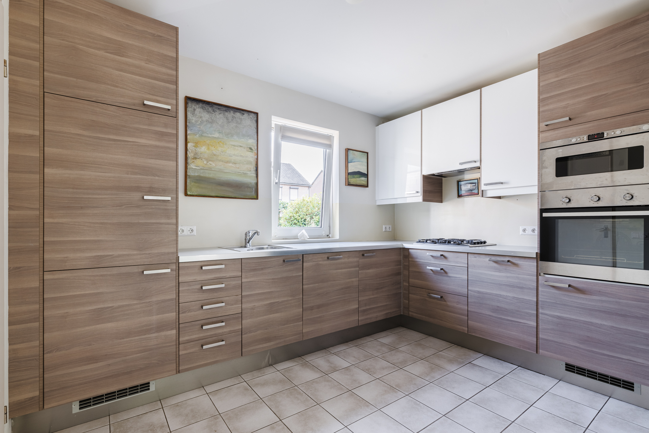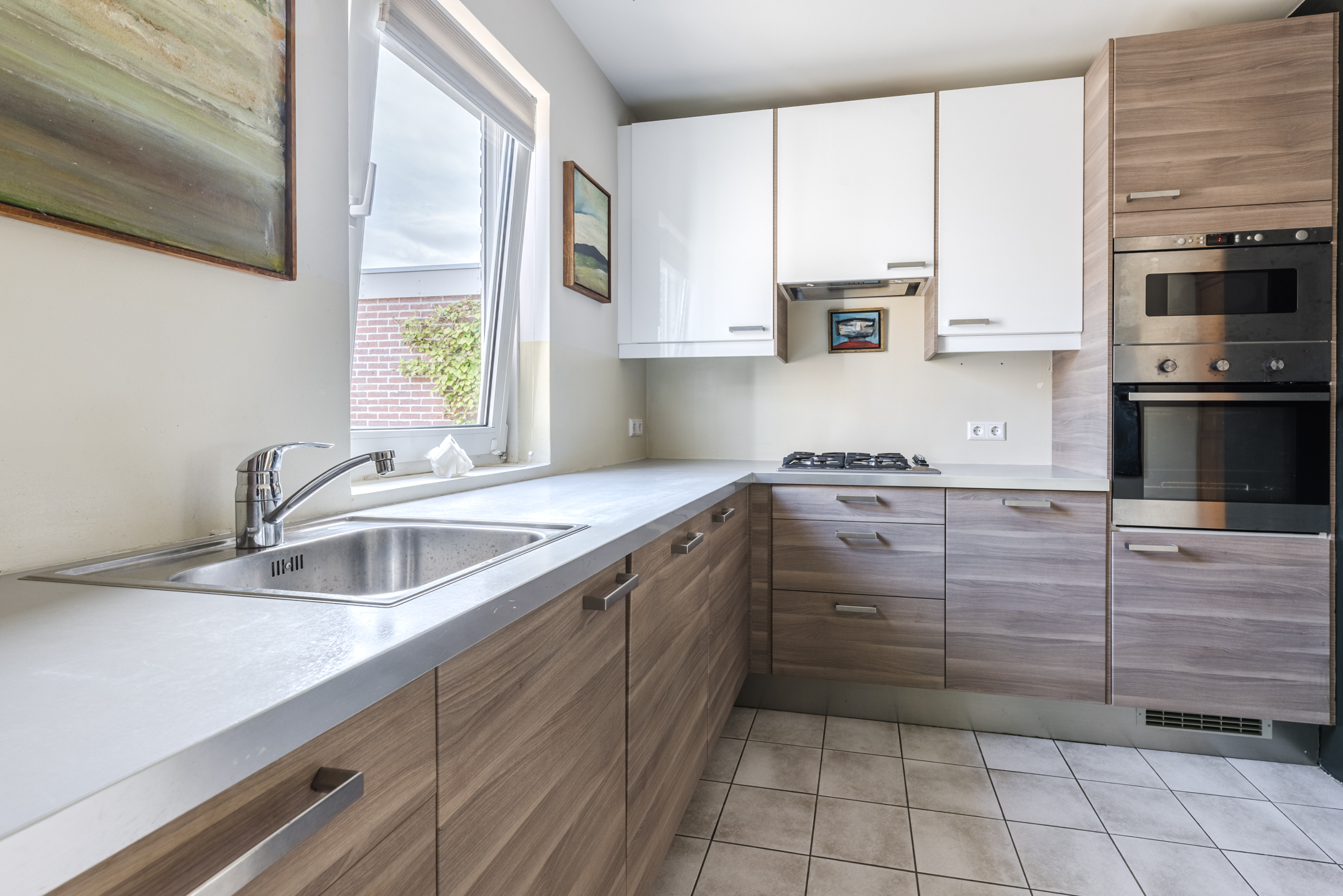 Je komt binnen in de hal, die toegang geeft tot de lichte woonkamer. Hier geniet je van een gezellige zithoek en een open keuken met volop werk- en kastruimte en een ruim eetgedeelte. De keuken is uitgerust met complete inbouwapparatuur: een vaatwasser, oven, magnetron, koel-vriescombinatie, 4-pits gaskookplaat én een afzuigkap. De grote ramen laten veel daglicht binnen en creëren een fijne, open sfeer.