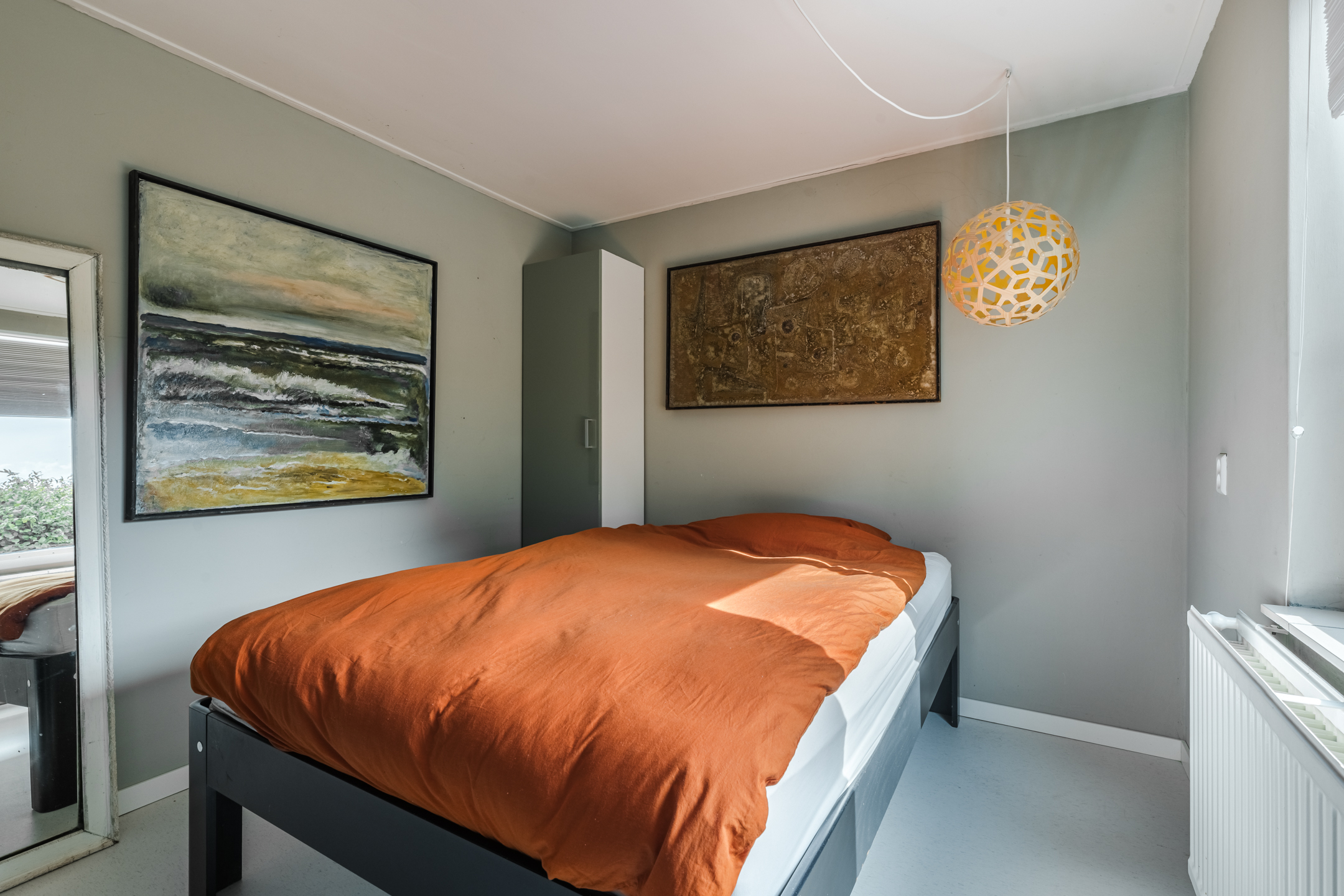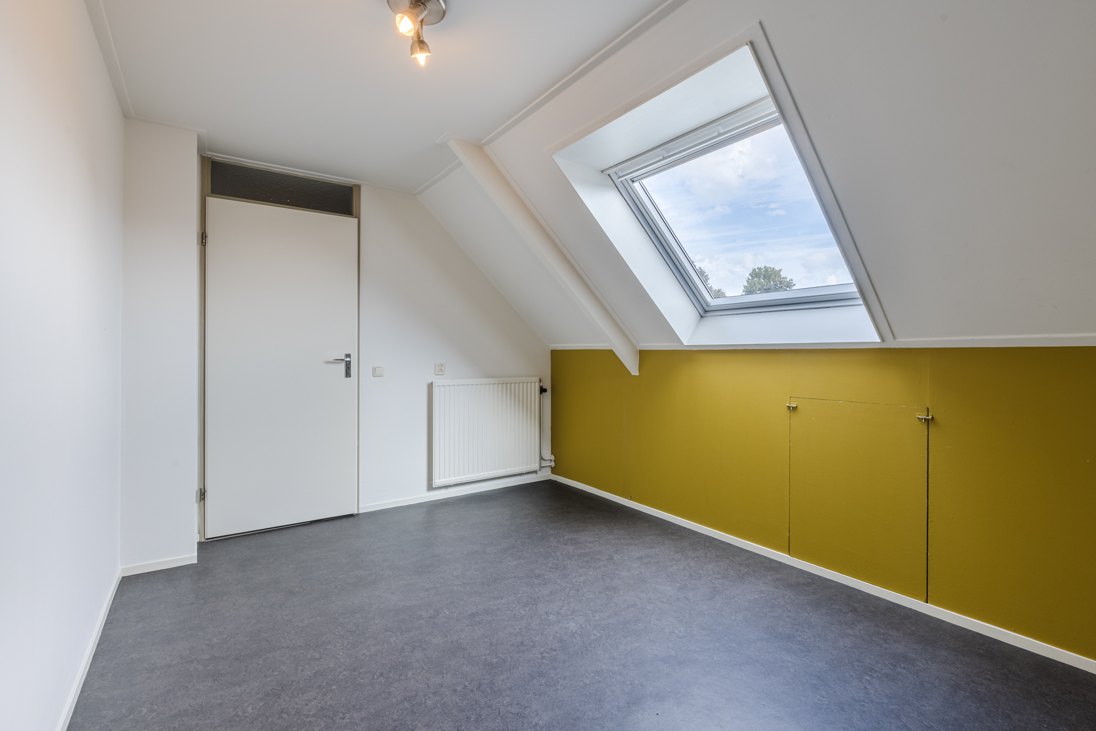 Via een vaste trap kom je op de eerste verdieping. Hier beschik je over twee ruime slaapkamers met linoleumvloeren, beide voorzien van Velux-dakramen die zorgen voor een prettige lichtinval. Onder de schuine kanten van het dak zijn handige bergruimtes gecreëerd in de vorm van knieschotten.