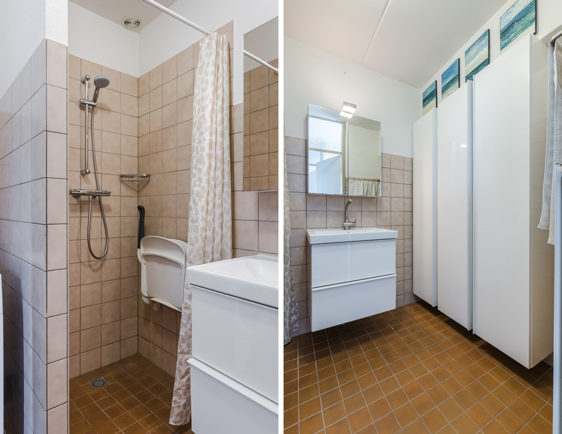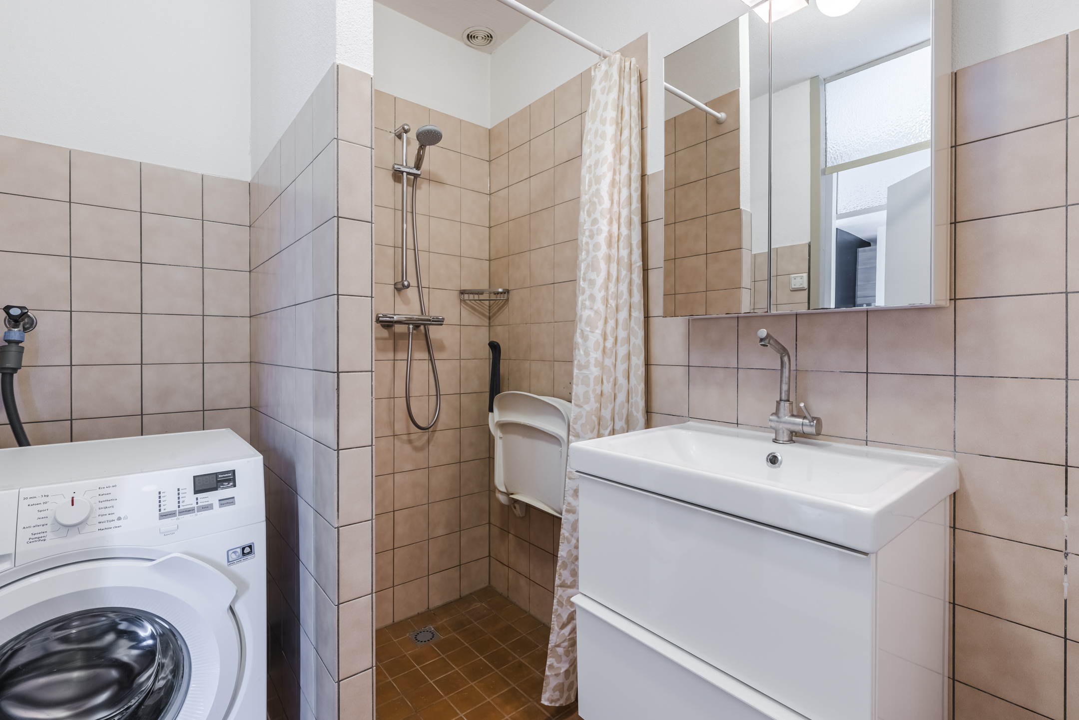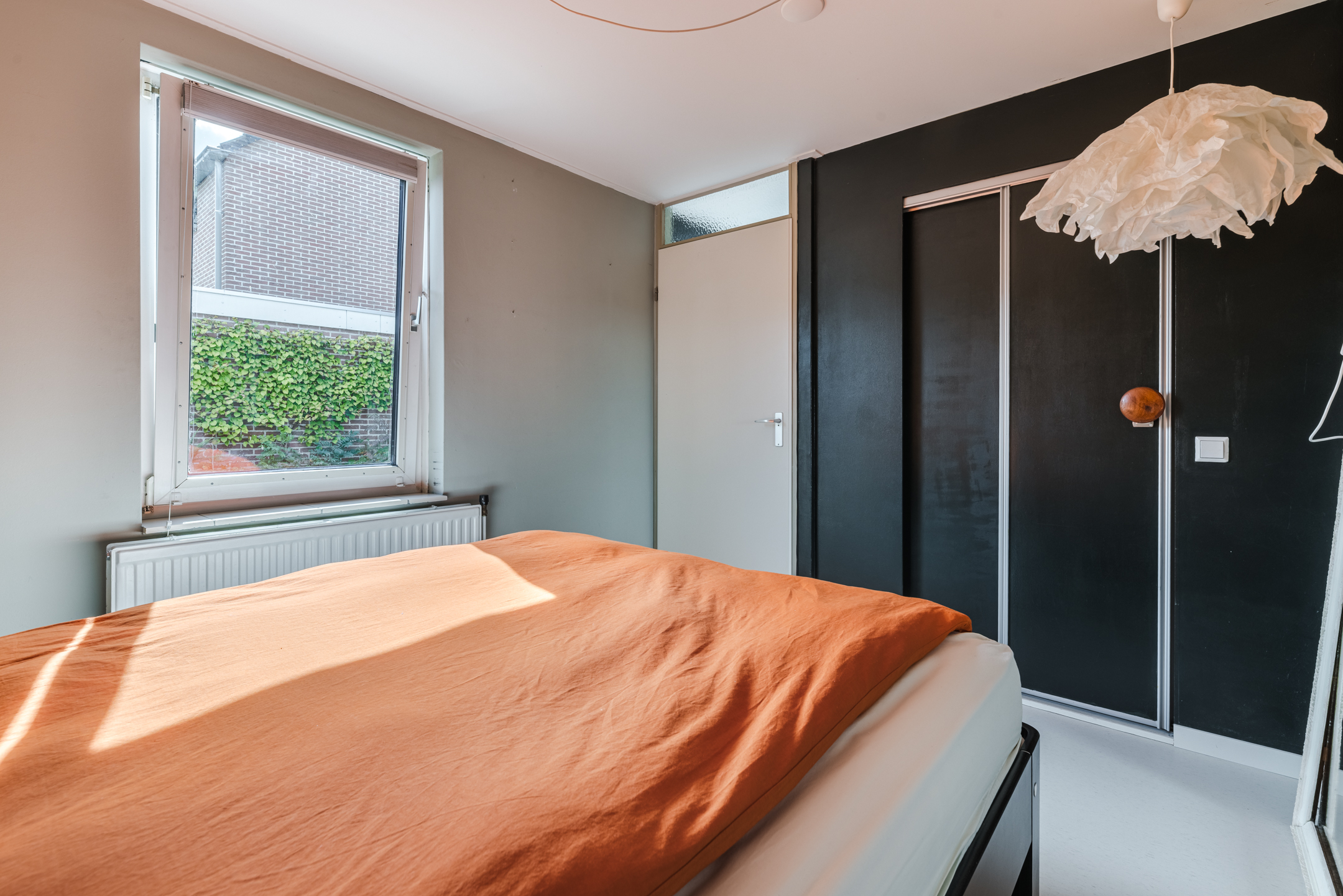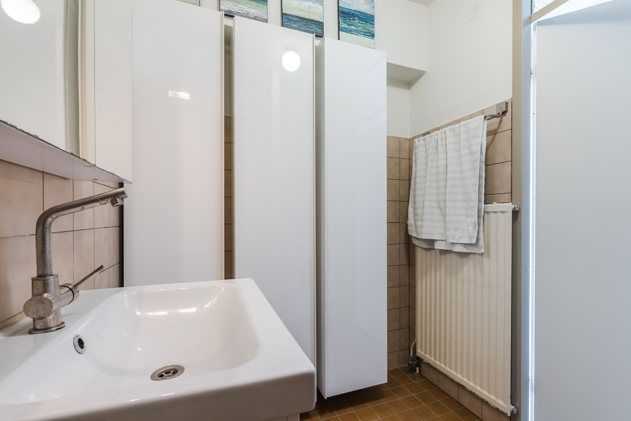 Op de begane grond vind je daarnaast een slaapkamer met vaste kastruimte, ideaal voor levensloopbestendig wonen. Deze ruimte is bereikbaar via een tweede hal in het hart van de woning. Vanuit hier is ook de badkamer met douche, wastafel, radiator en witgoedaansluiting te bereiken. De separate toiletruimte is voorzien van een fonteintje.